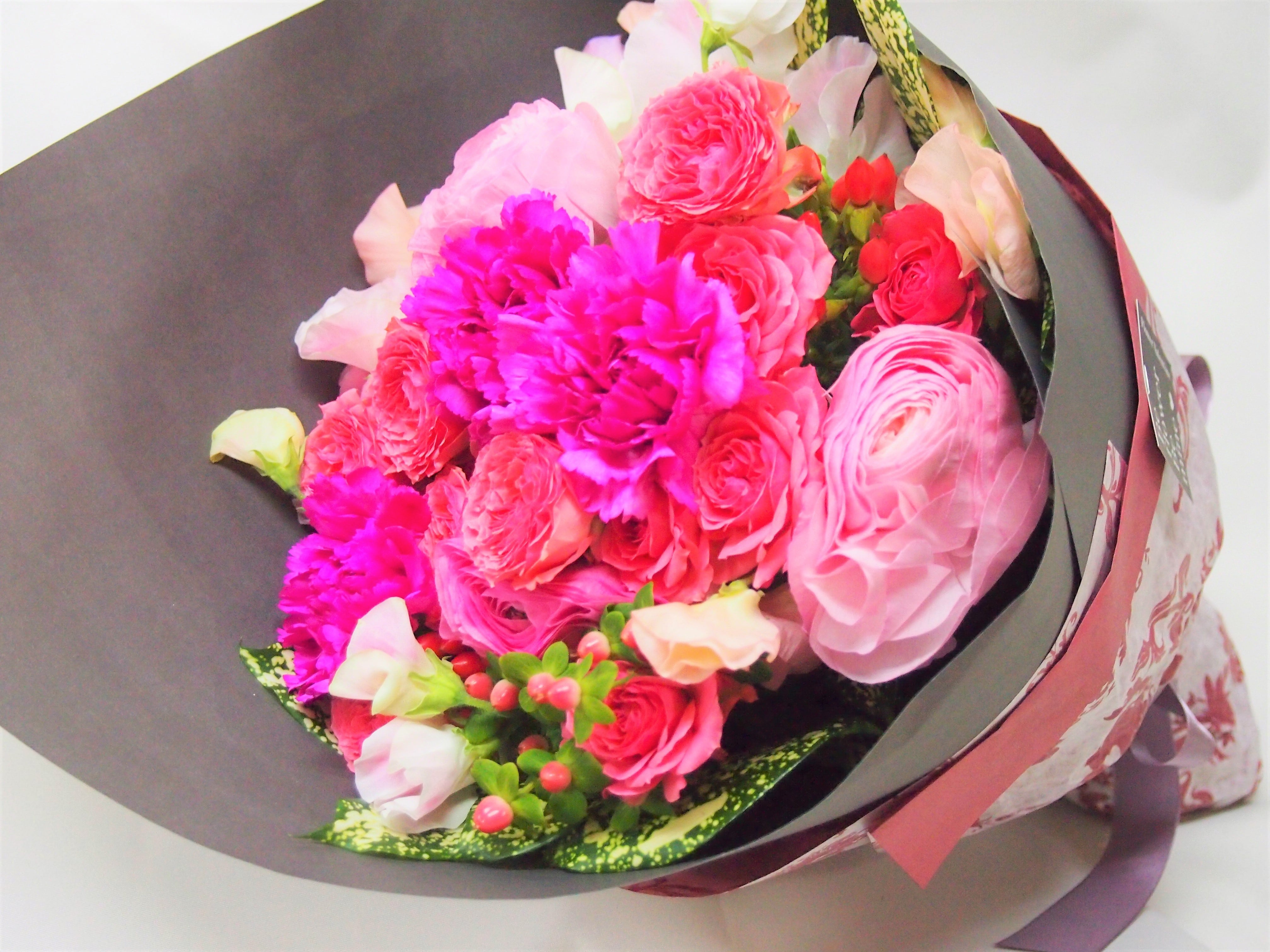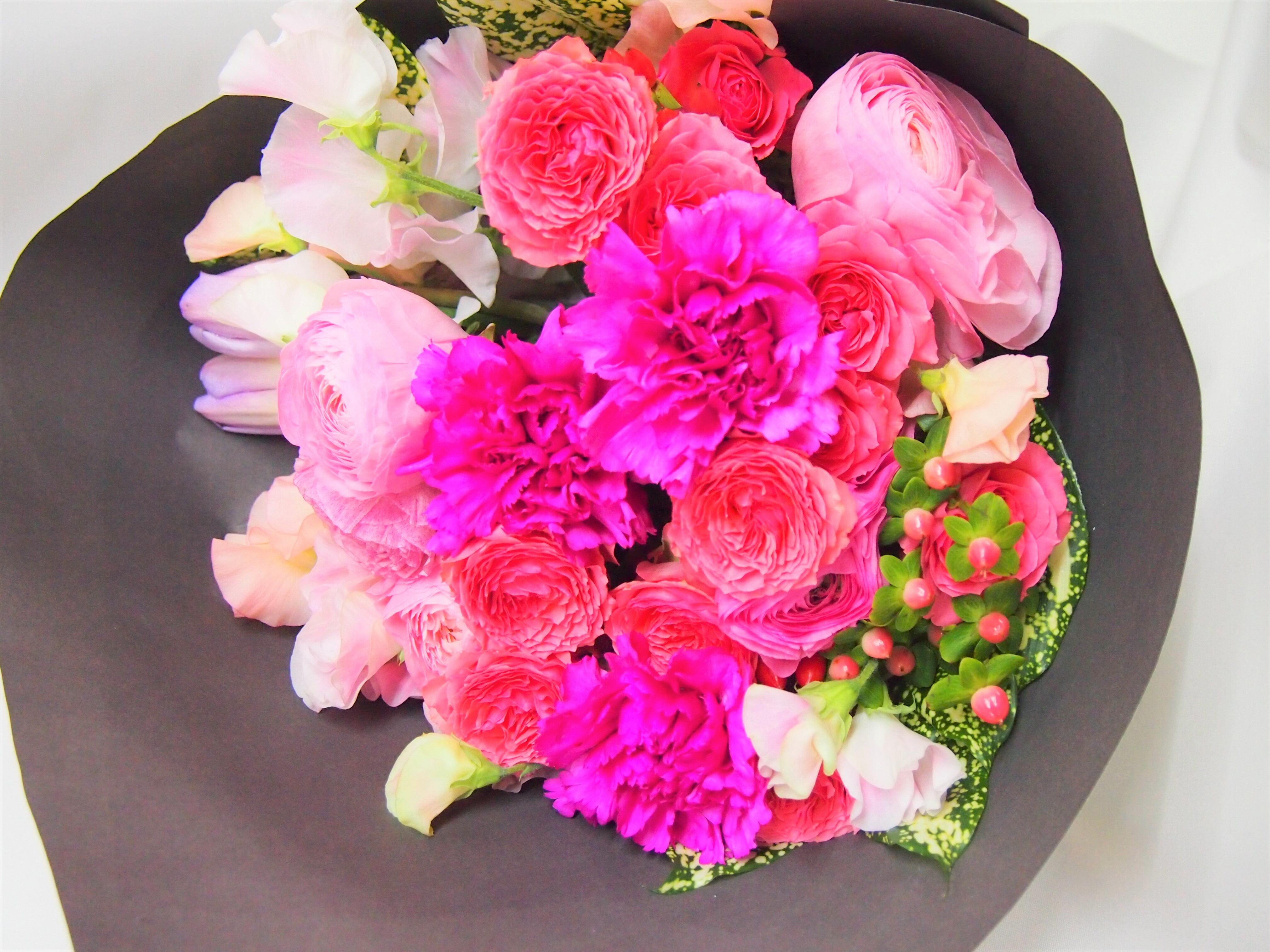 ピンク系のカーネーション・ラナンキュラスなどのお花でまとめました♪